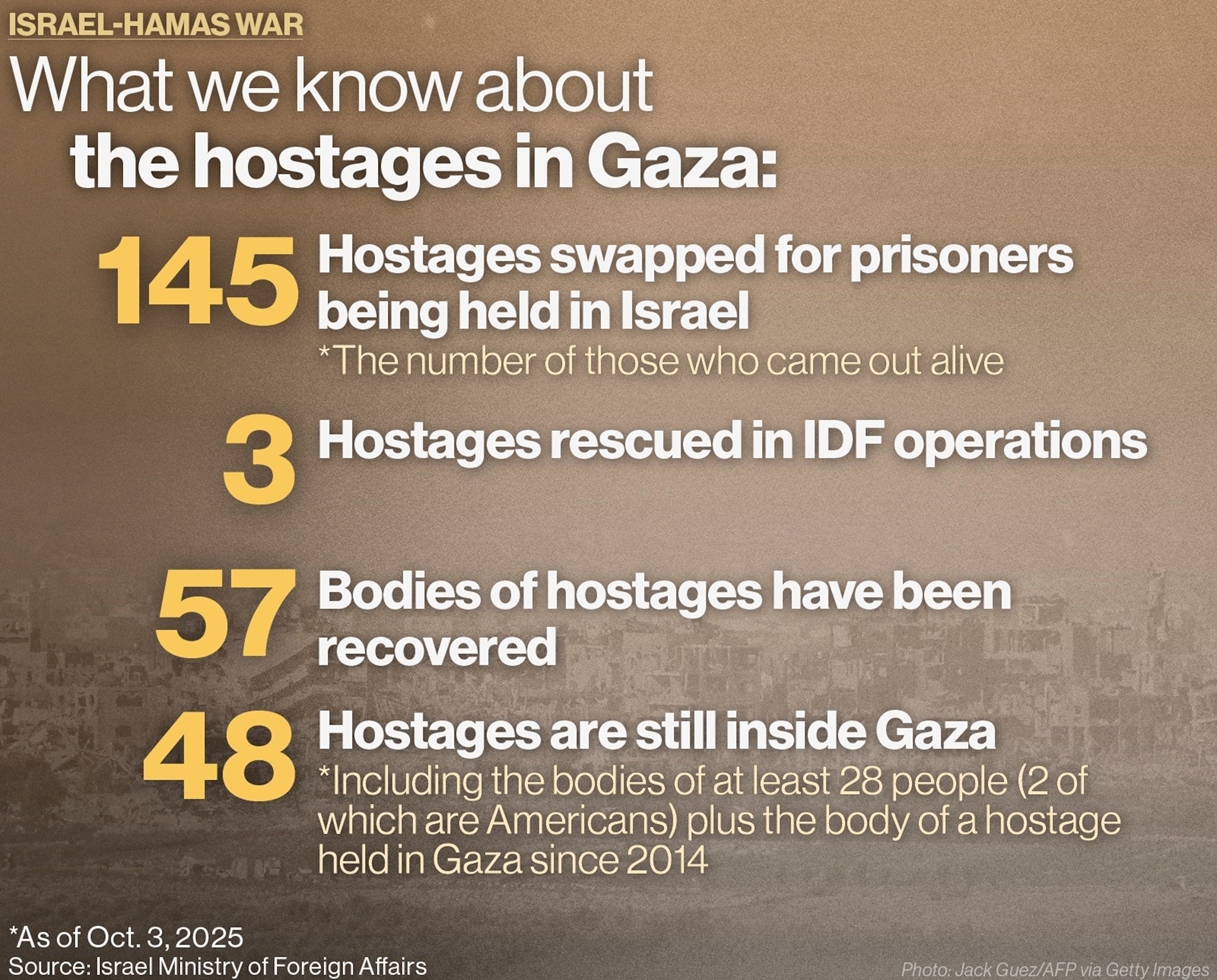 About 48 hostages remain in Gaza, including the bodies of at least 28 people no longer believed to be alive, according to Israeli officials. The latter figure includes the bodies of two Americans and the body of a hostage held in Gaza since 2014.