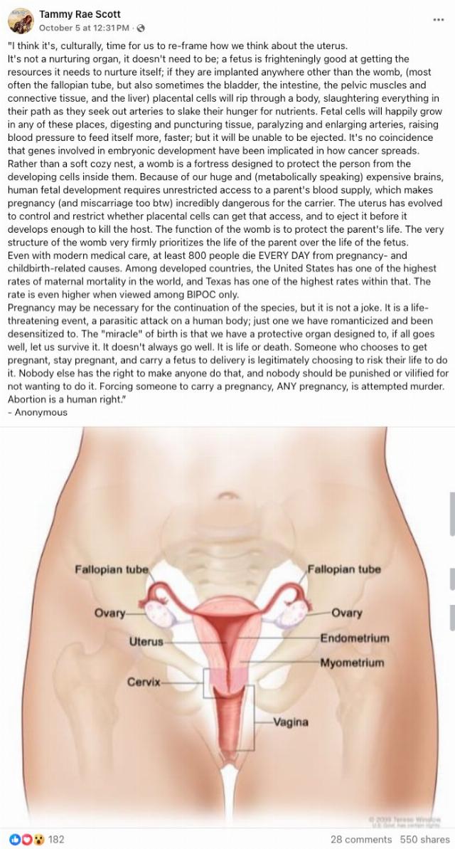 Rather than a soft cozy nest, a womb is a fortress designed to protect the person from the developing cells inside them. Because of our huge and (metabolically speaking) expensive brains, human fetal development requires unrestricted access to a parent’s blood supply, which makes pregnancy (and miscarriage too btw) incredibly dangerous for the carrier. The uterus has evolved to control and restrict whether placental cells can get that access, and to eject it before it develops enough to kill the host. The function of the womb is to protect the parent’s life. The very structure of the womb very firmly prioritizes the life of the parent over the life of the fetus.