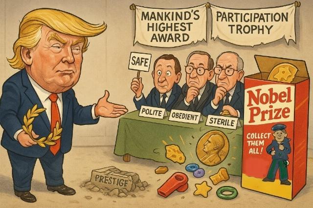 The Nobel Prize Committee members can congratulate themselves on denying Trump the award but all they have succeeded in doing is to prove the existence of “Trump Derangement Syndrome,” and confirming that future aspirants for the prize must submit to an “ideological litmus test,” something on the order of being “safe, polite, obedient, and sterile,” as Sinclair Lewis said. The result is that the prestige of the Nobel Peace Prize has been severely diminished. No longer can it be regarded as mankind’s highest award. Now it can be compared to a cheap trinket that one used to get in a box of Cracker Jacks.