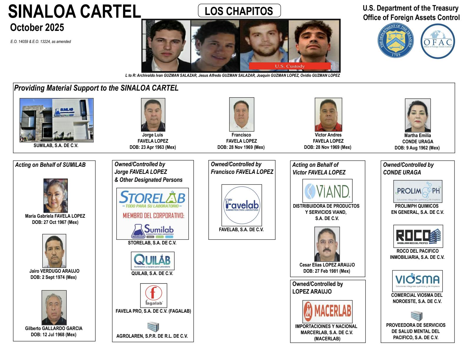 The main company targeted by the sanctions is Sumilab, which the department said was responsible for shipping fentanyl precursor chemicals to the Sinaloa Cartel. A number of individuals affiliated with the company, including Jorge Luis Favela Lopez, Francisco Favela Lopez, Victor Andres Favela Lopez, and Martha Emilia, were all sanctioned.