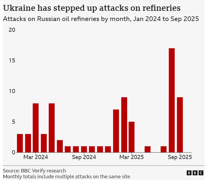 BBC Verify reports that Ukraine’s drone strikes have hit 21 of Russia’s 38 large oil refineries since January, a number already 48% higher than the entire total for 2024. Its analysis of Russian media and verified footage shows the attacks reached record levels in August and remained high in September, with impacts visible in fuel availability and rising prices.