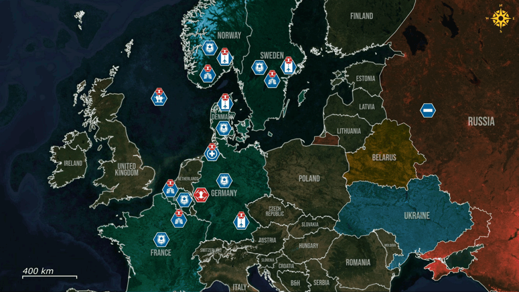 Denmark, where Ukraine will soon produce components for its Flamingo missiles, has seen repeated incidents. Germany and Belgium, hosts of major logistics and training hubs, have been probed as well.