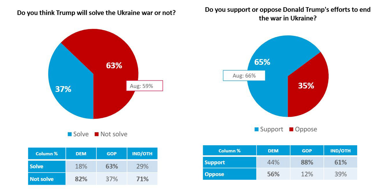 While 65% of Americans support US President Donald Trump’s efforts to end Russia's war in Ukraine, a 63% majority say he will not be able to actually solve the conflict, according to the same poll.