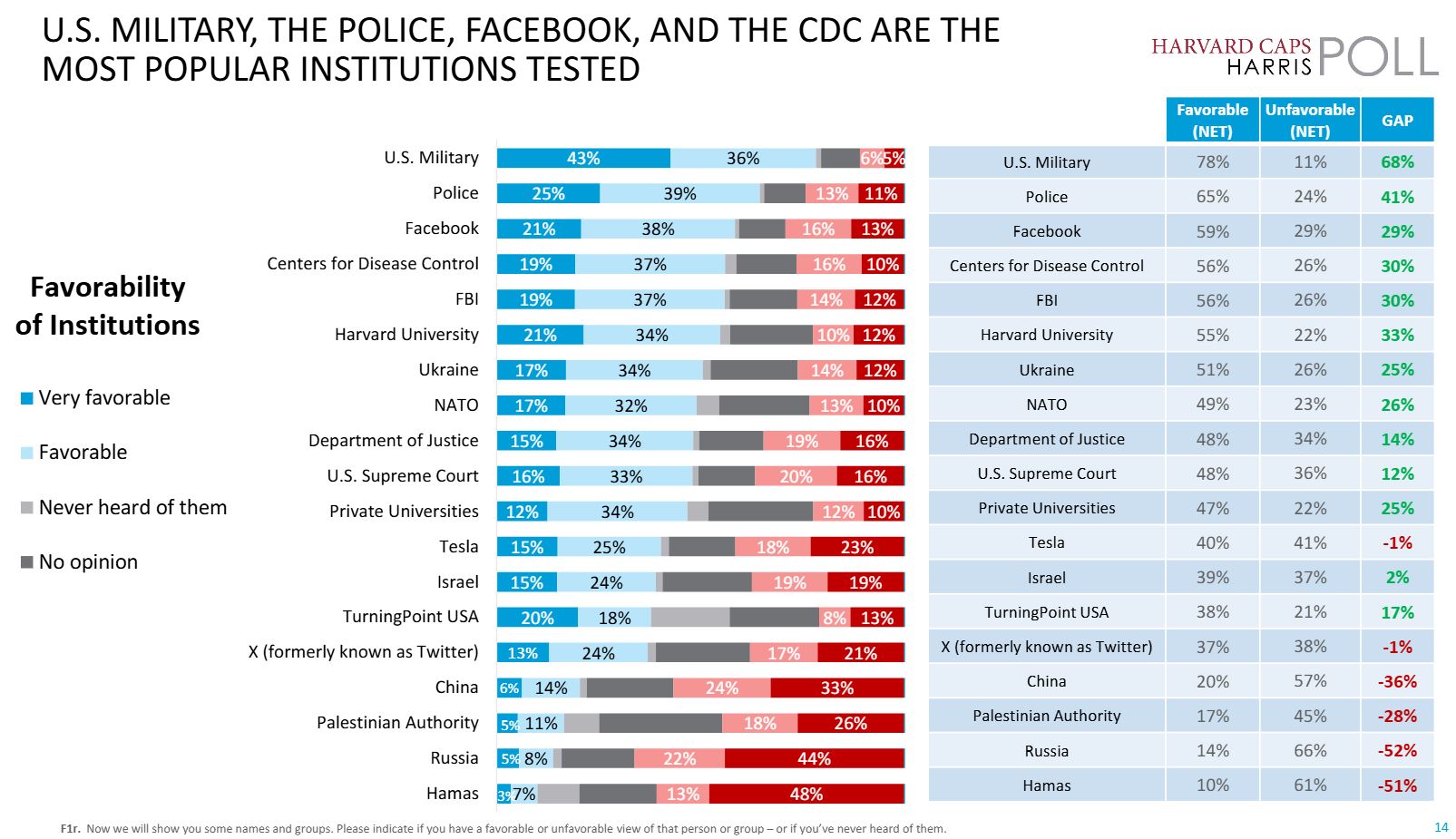 In the “favorability of institutions” ranking, Ukraine places seventh — slightly behind Harvard University and slightly ahead of NATO in overall favorability — while sharing the same 17% “very favorable” rating as NATO.
