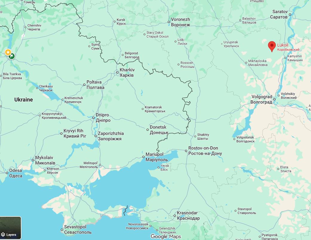 Supernova+ reported that the Lukoil-Korobkovsky gas processing plant in Kotovo was attacked during the night, and stated that two separate fires were visible at the site. The footage showed a glow over the horizon, geolocated at 50.344909, 44.710195.