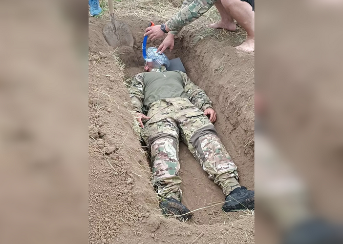 After that, he lies down in a pit and is buried in it. A diving mask with a tube is given for mouth breathing. In such a “training grave,” a serviceman lies from 40 minutes to four hours.