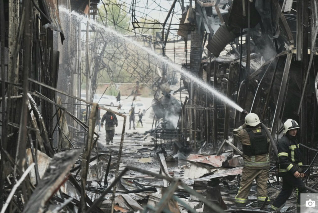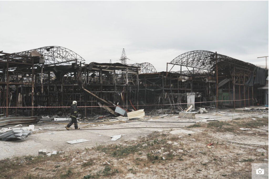 The Barabashovo market in Kyivskyi district sustained direct hits, with trading pavilions covering 2,800 square meters catching fire.