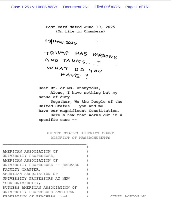 Judge William G. Young is 85-years-old. The media describes him as a Reagan appointee, which is meaningless if you understand where those judges were coming out of. His apparently unique approach of issuing a ruling with what looks like an anti-Trump crayon rant is in the service of defending foreign national supporters of Muslim terrorism on campus, but reads like an unhinged substack from a fired NPR employee.