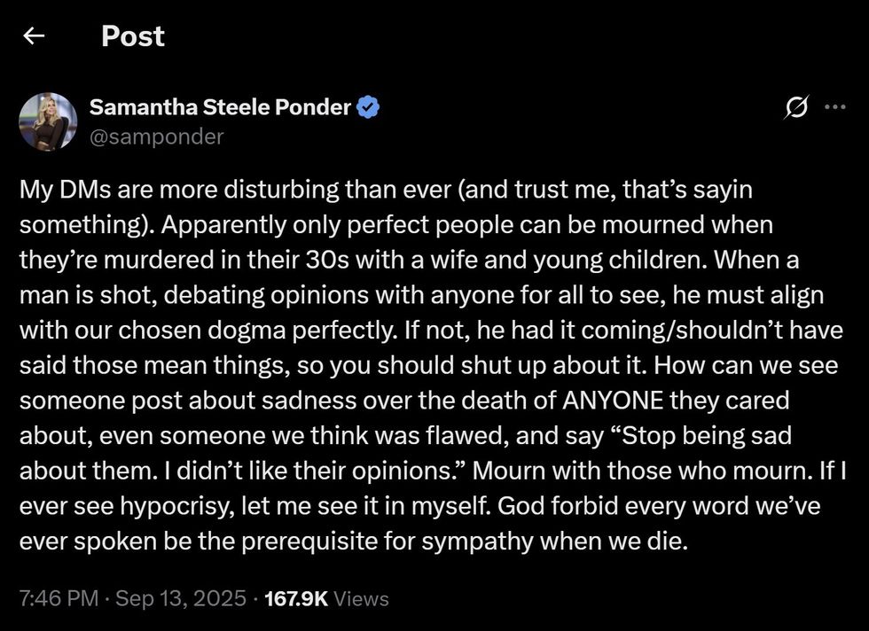 Former ESPN presenter Samantha Ponder has faced a barrage of hostile messages following her public expressions of grief over the killing of the 31-year-old conservative commentator last week.