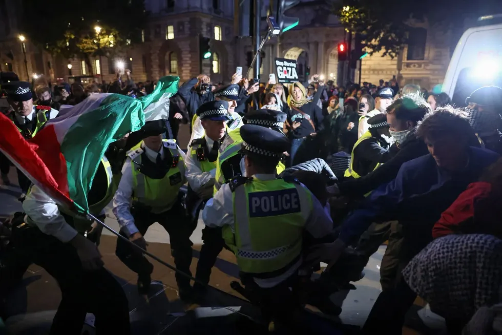 A group of pro-Palestinian protesters were arrested after clashing with Met Police officers in London yesterday evening, with some chanting "death to the IDF" just hours after the attack at the Manchester synagogue.
