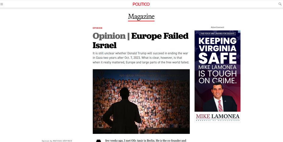 Mathias Döpfner — CEO of Politico and Business Insider's parent company Axel Springer SE — penned an October 7 op-ed dissecting his discussions with Nova Music Festival co-founder Omir Affir, a survivor of the wanton slaughter terrorist organization Hamas unleashed upon the Jewish people two years earlier. Döpfner speculated on how survivors like Affir are able to deal with European leaders and others grotesquely painting them as the perpetrators while Hamas and their death cult cohorts are the true victims.