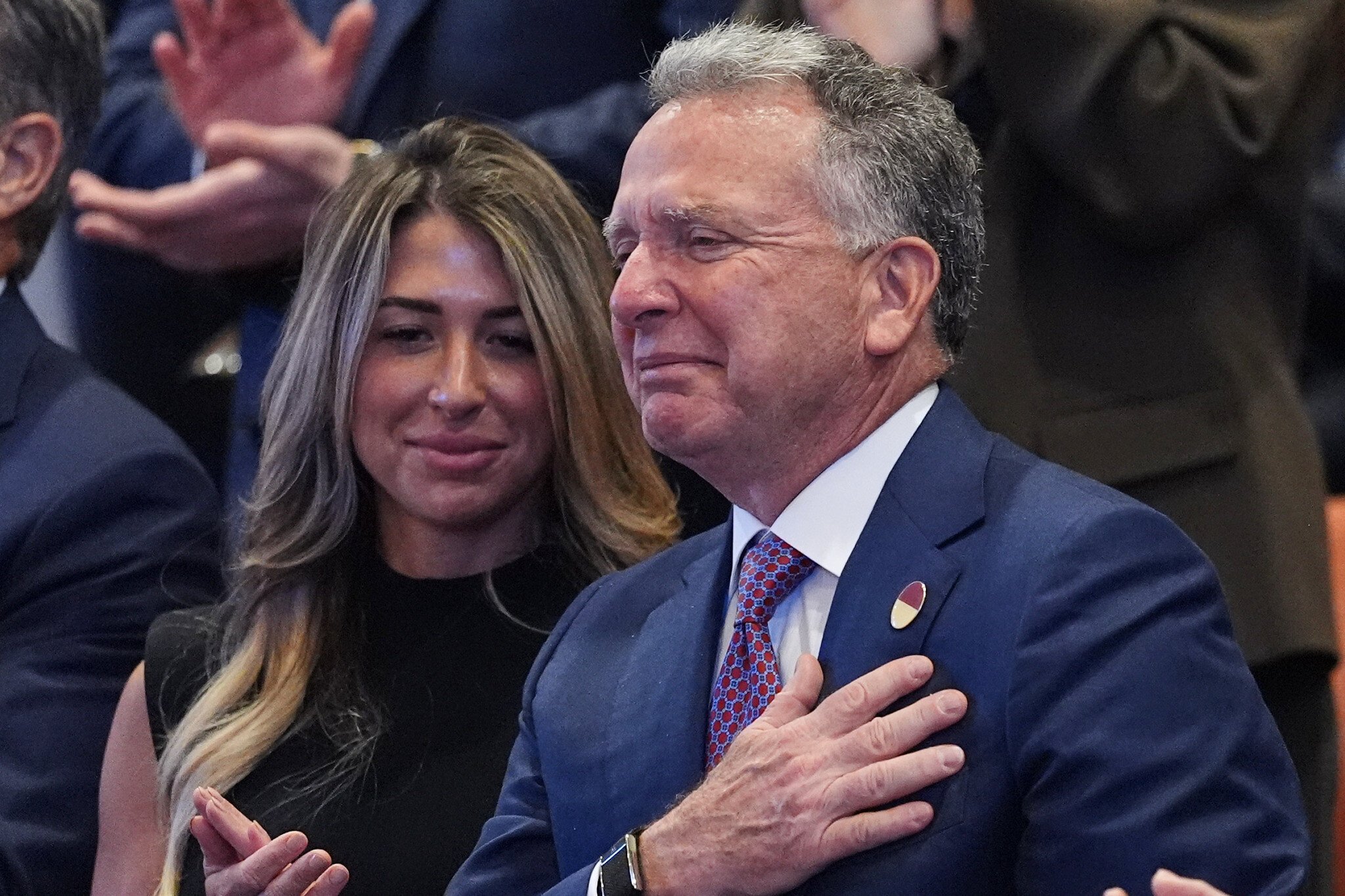 Isn’t that right, Miriam? Look at Miriam [Adelson]. She’s back there. Stand up now. Stand up. Miriam and Sheldon would come into the office. They’d call me, he’d call me. I think they had more trips to the White House than anybody else I can think of. Look at her, sitting there so innocently. She’s got 60 billion in the bank. 60 billion. And she loves, and she… I think she’s saying, “No more.”
