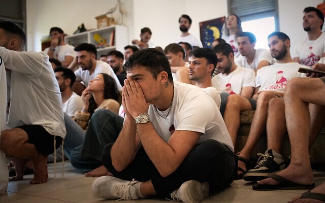 Family and friends of hostage Rom Braslavski watch ahead of his release from Hamas captivity in Jerusalem, October 13, 2025 (Arie Leib Abrams/Flash90)