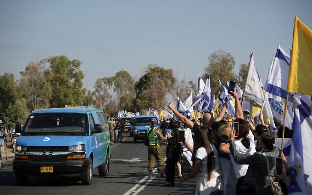 Others lined the roads outside the Re’im base in southern Israel, where the released hostages were set to arrive after being transferred by the Red Cross to Israeli forces in Gaza, cheering on the families that came to be reunited with their loved ones and waiting to welcome the freed hostages once they make their way to hospitals in central Israel.