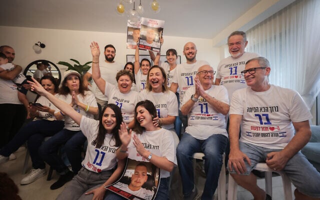 Family and friends of Israeli hostage Alon Ohel watch his release from Hamas captivity in Moshav Lavon, October 13, 2025. (Michael Giladi/Flash90)