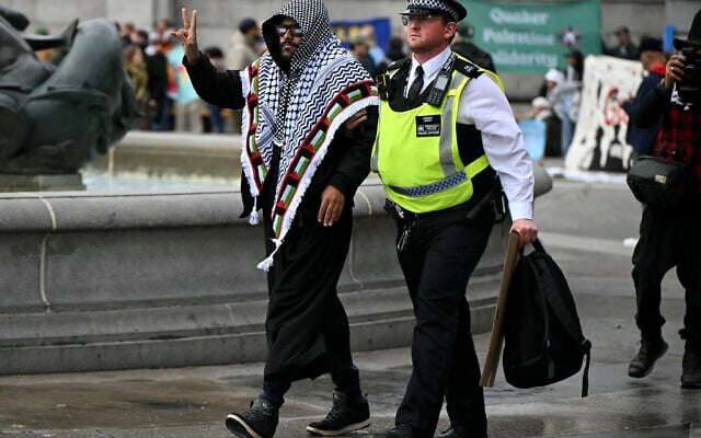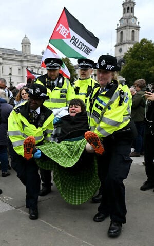 LONDON — London police arrested over a hundred protesters for supporting a banned pro-Palestinian group at a demonstration on Saturday, which went ahead despite requests to call it off after a deadly terror attack at a synagogue in Manchester during Yom Kippur.