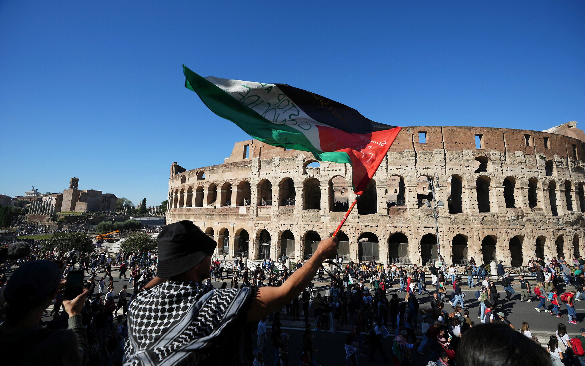 A protest in Rome was also underway, organized by three Palestinian organizations along with local unions and students. People holding banners and Palestinian flags, chanting “Free Palestine” and other slogans, filed past the Colosseum, taking part in a march that organizers claimed attracted hundreds of thousands of people.