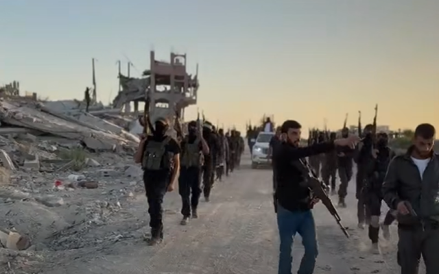 Hamas on Monday night published a video showing its armed personnel publicly executing eight blindfolded, bound and kneeling men in the street, with the group saying that its forces were “carrying out the death sentence against a number of collaborators and outlaws in Gaza City.”