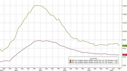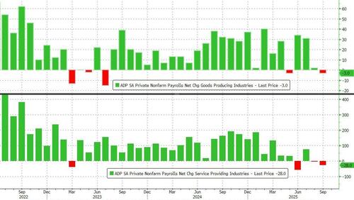 Adding to the confusion is that the original number was actually well higher, at 11K, but after the ADP conducted its annual preliminary rebenchmarking of the National Employment Report in September based on the full-year 2024 results of the Quarterly Census of Employment and Wages (which as a reminder eliminated 911K jobs from the Biden regime that were never actually there), there was a reduction of 43,000 jobs in September compared to pre-benchmarked data. The trend was unchanged; job creation continued to lose momentum across most sectors.