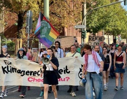 That’s Luisa Neubauer herself, marching with a smattering of leftist activists in Potsdam. The banner behind her reads: “For climate justice. Do you get it?” Since the war in Gaza we hear a lot more about “climate justice” than we do about “climate change”, because the climatoids are no longer leading the eternal Leftist protest. Anticolonialism is more important; CO2 only matters to the extent it represents a Western injustice imposed upon brown people somewhere. In fact, on the Left, climatism is taking a back seat to all kinds of other concerns. This would be why our climatoids have pasted their logo onto the trans flag and why they have to march alongside activists carrying banners complaining about ‘the rich’ and taking potshots at ‘Nazis’. The whole movement is devolving into the standard Leftoid grievance gruel.