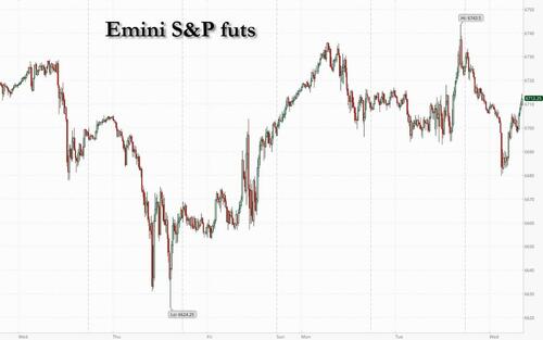 US stock futures are weaker to start the new quarter but have cut overnight losses by more than a third, as the first US government shutdown in nearly seven years begins. The first shutdown during Trump 1.0 lasted 3 days and the second shutdown 35 days: how long will this one last? As of 8:00am ET, S&P futures are down 0.4%, but well off session lows while Nasdaq futures drop 0.5%. Gold futures, up almost 1%, continue their advance toward $4,000. Pre-mkt, we are seeing a risk-off tone in US assets, including USD weakness, helping buttress international markets where Eurostoxx 50 set a new intraday ATH led by health care and communication sectors. Mag7 names are mostly lower with Semis also pressured; NKE gains 3% post solid earnings. The yield curve is twisting steeper. Commodities are weaker ex-Precious Metals with silver outperforming gold. With Friday's NFP release all but certain to be delayed, ADP takes on heightened importance today; we also receive ISM-Mfg, construction spending, vehicle sales, and mtge applications.