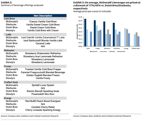 McDonald's beverages per ounce are priced at a discount of high teens/low 40% on average vs. Dutch Bros/Starbucks, respectively, based on our analysis of menu pricing for an array of offerings across 11 cities in Colorado as a way to assess which brands offer strong value in an increasingly competitive environment (Exhibit 3). Notably, Starbucks did not have any comparable offerings for two of the six categories analyzed, as the company aims to reduce operational complexity through a simplified menu, and offered the most expensive option across the remaining four categories.