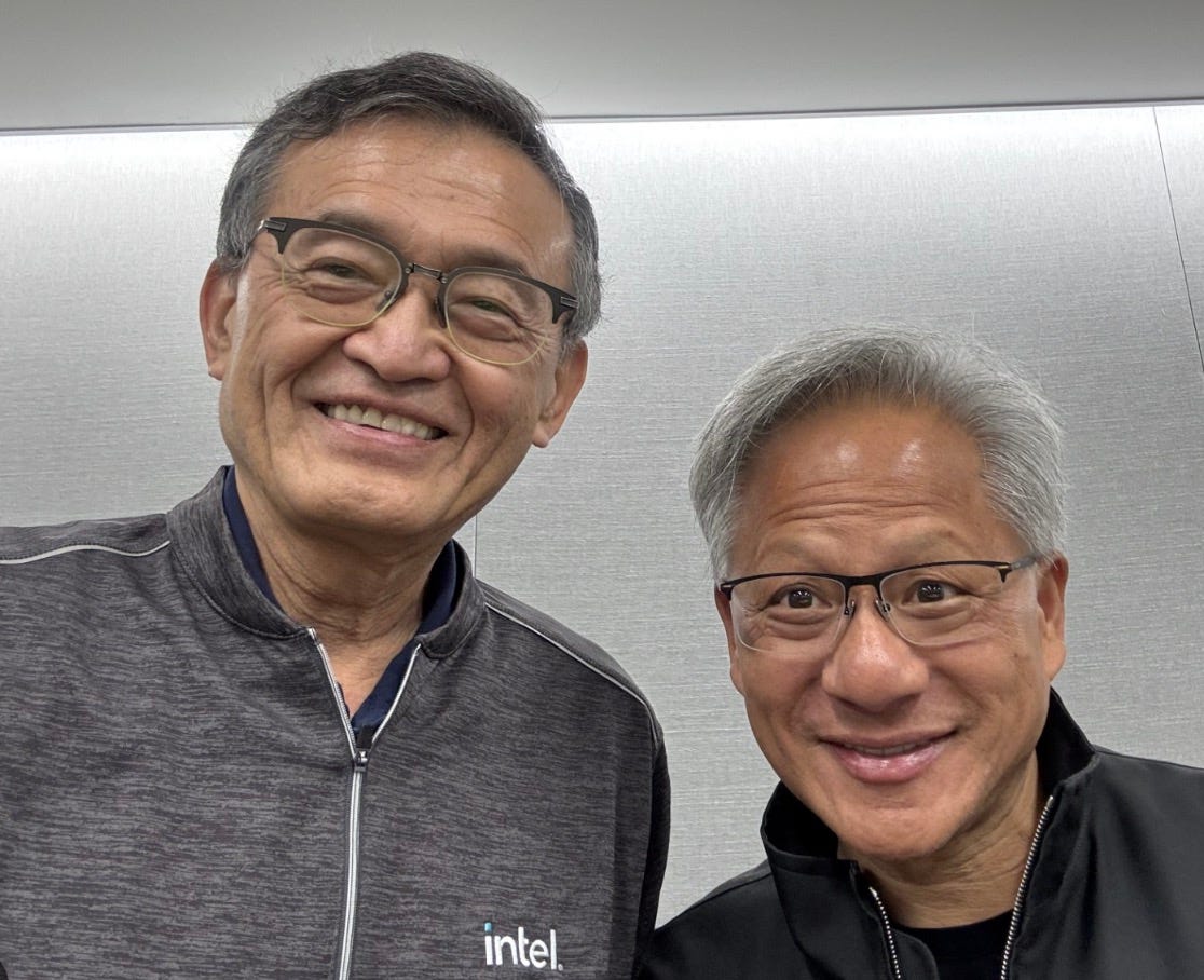 Enter Nvidia. Nvidia’s $5 billion investment instantly makes it one of Intel’s largest shareholders. The two companies will co-develop chips for PCs and data centers, combining Nvidia’s GPUs with Intel’s CPUs and packaging. Unlike Microsoft in 1997, Nvidia isn’t 100 times bigger—but it is close to thirty times Intel’s size today, with a market cap hovering near $4.2 trillion. In other words, it has the same role Microsoft did: the giant throwing a lifeline to a fallen icon.