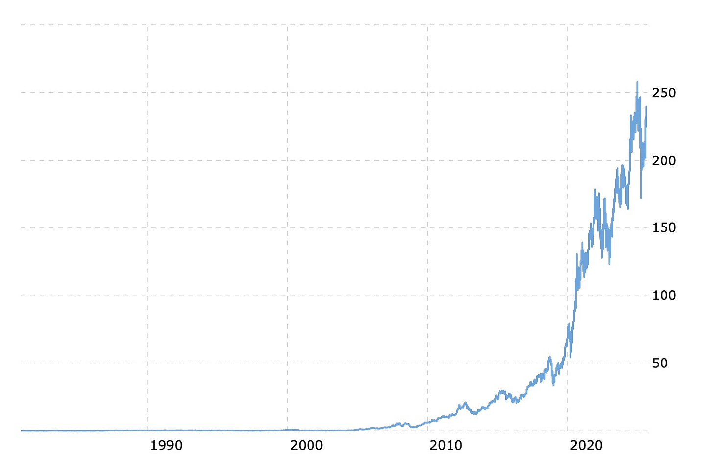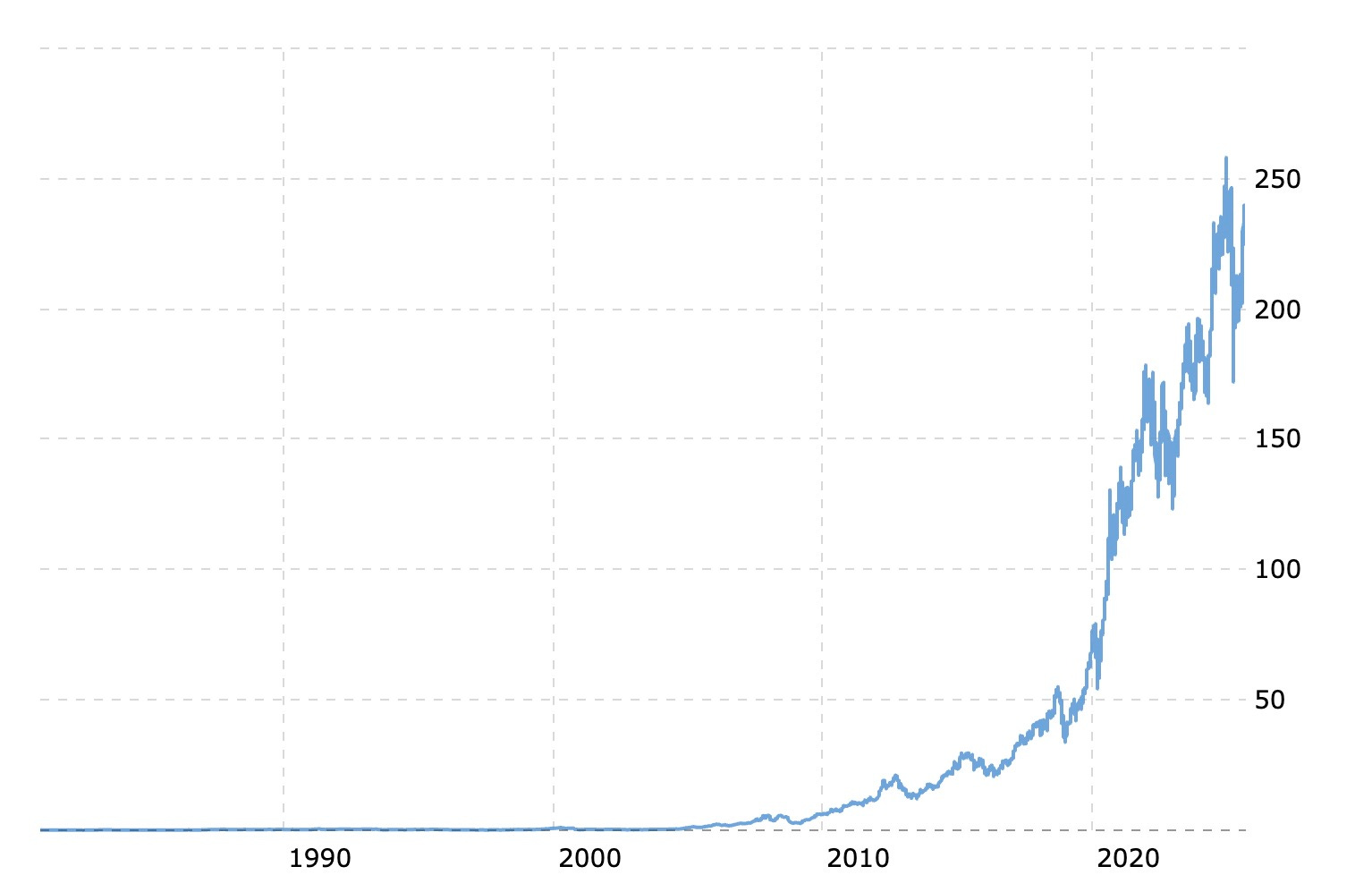 In the 45 year chart of Apple stock below, it looks like it was at $0 back then because, basically, it was. Apple traded at a split adjusted price of $0.16 per share.