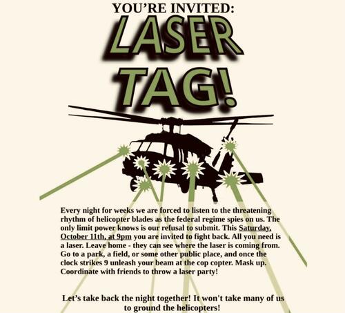 "Every night for weeks we are forced to listen to the threatening rhythm of helicopter blades as the federal regime spies on us...This Saturday, October 11th, at 9pm you are invited to fight back. All you need is a laser. Leave home -- they can see where the laser is coming from. Go to a park, a field, or some other public place, and once the clock strikes 9 unleash your beam at the cop copter.