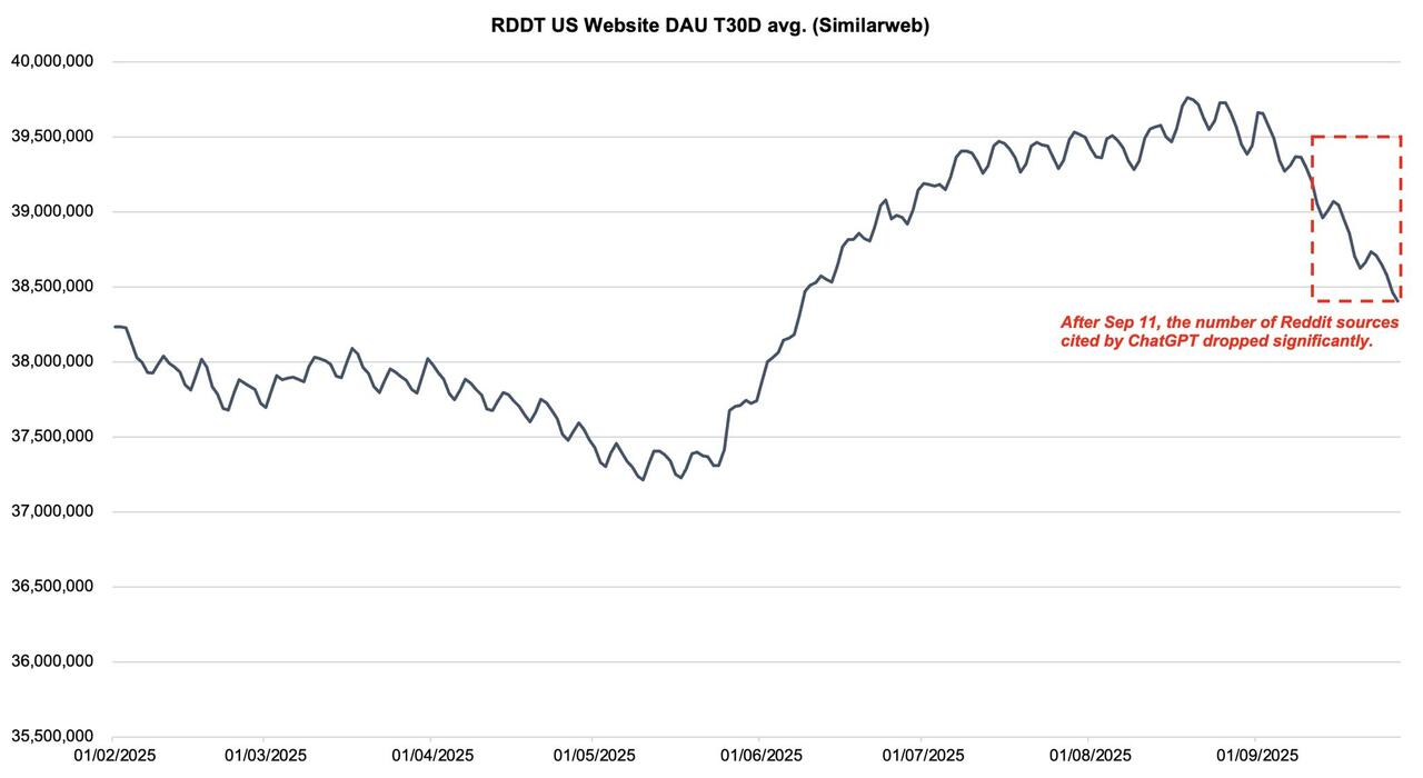 Tian posted an image showing Reddit's U.S. daily active users on a 30-day average, indicating that around September 11 was the point when Reddit sources cited by ChatGPT dropped sharply.
