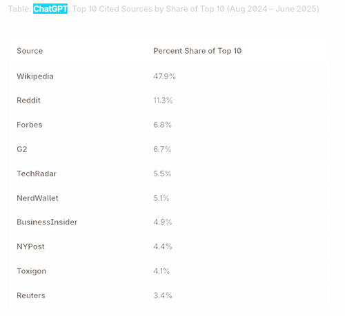 TryProfound blog cited a dataset between August 2024 and June 2025 that showed Reddit accounts for 11.3% of ChatGPT's citations within its top 10 most-cited sources.