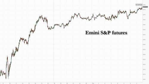 US equity futures are higher with tech and small caps both outperforming as the screaming AI euphoria drove global indexes to fresh highs after an OpenAI share sale valued the company at an eye-popping $500 billion, catapulting the firm to become the world’s most valuable startup, surpassing SpaceX. As of 8:00am ET, S&P futures were 0.2% higher, trading at a fresh all time high, and Nasdaq 100 futures climbed 0.5%, putting the gauge on track for a fifth straight gain. Pre-market, Mag7 tech are mostly higher led by NVDA (+1.3%) and TSLA (+1.5%); global chipmakers soared and energy REIT Fermi jumped for a second day after its IPO. We have also seen overnight outperformance in both European and Asian markets despite relatively muted incremental news flows: Europe’s Stoxx 600 also hit a record after rising 0.8%, led by an advance of more than 2% in technology shares. In Asia, equities rose past last month’s record close as chipmakers rallied. MSCI’s global index also notched a fresh high. Bond yields are unchanged; USD is lower; Oil is lower, while metals are higher. Today's Initial and Continuing Claims data will be delayed due to the shutdown; we should get the final August Durables/Factory orders prints at 10am.