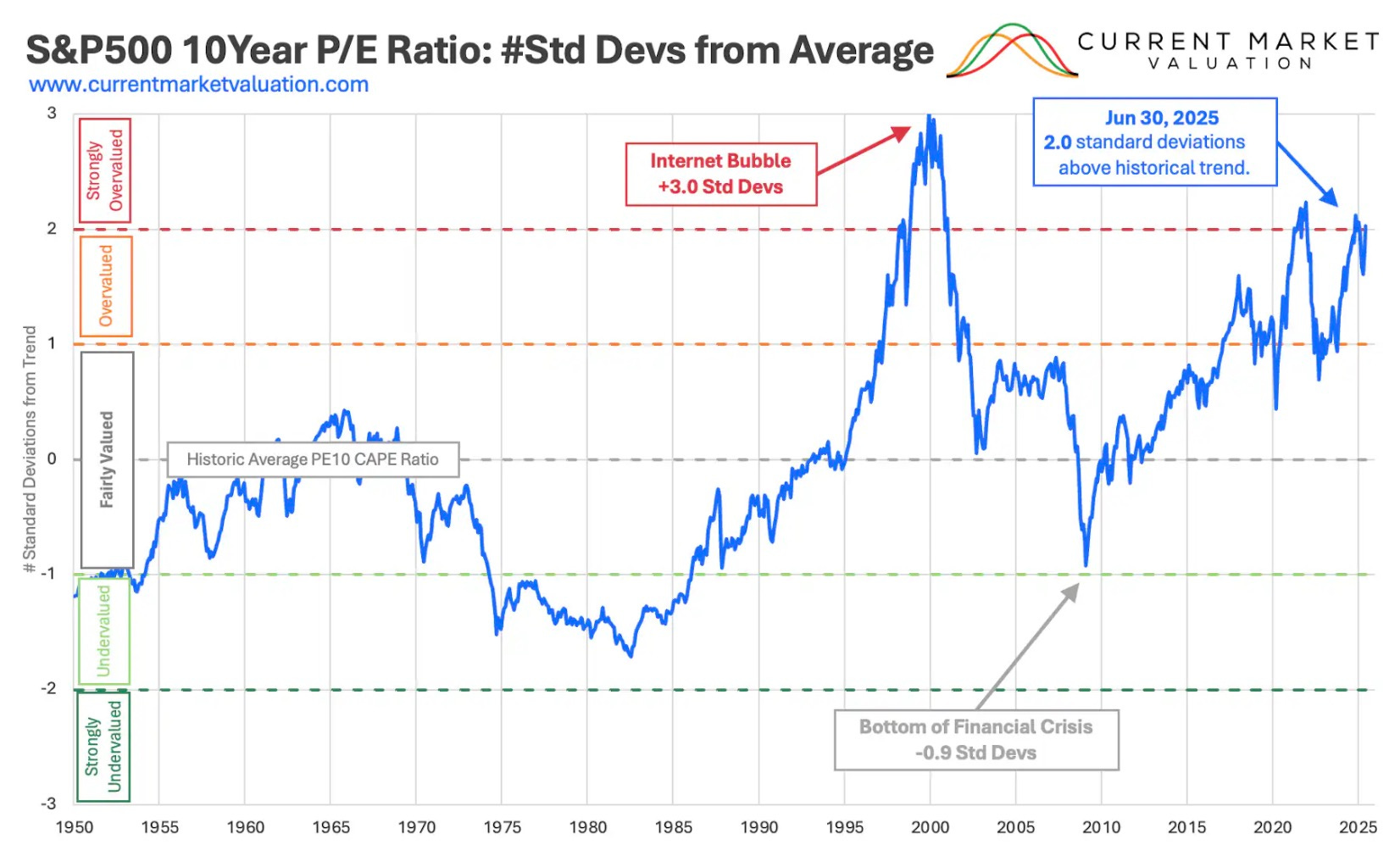 I opened by pointing out where we are in this cycle: “we’ve got a stock market at all-time high valuations.” On multiple measures—market cap to GDP, Shiller PE, and others—we’re “either at or damn close to all-time highs.”